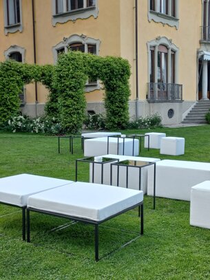 Offriamo una selezione di arredi a noleggio e collezioni di arredo specifiche per matrimoni, come divani, poltrone, lounge, pouf, tavolini, accessori tessili, complementi di arredo.